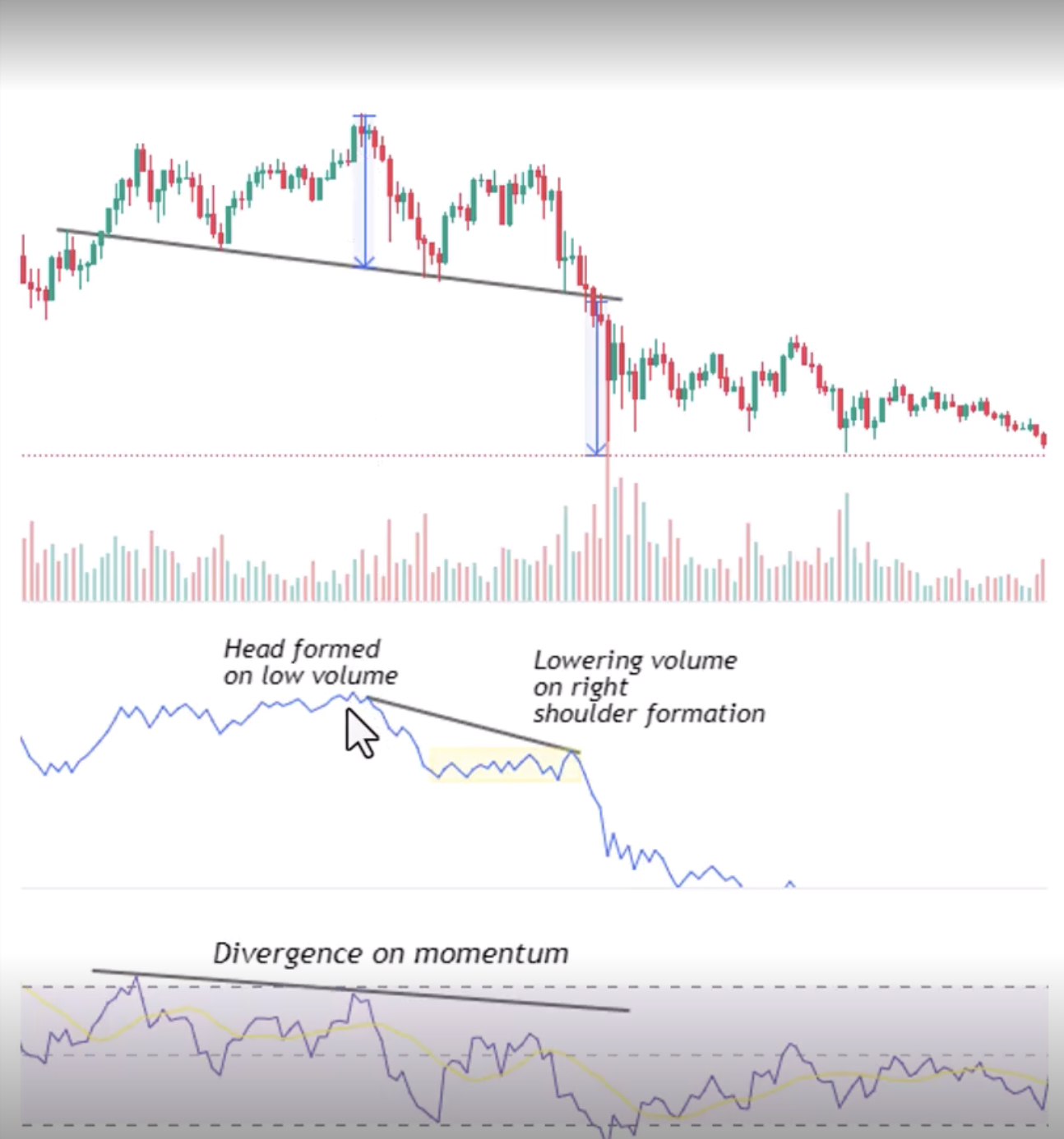 - When the neck line is broken, the pattern is confirmed and there should be increasing down volume on the sell off (even lower OBV)