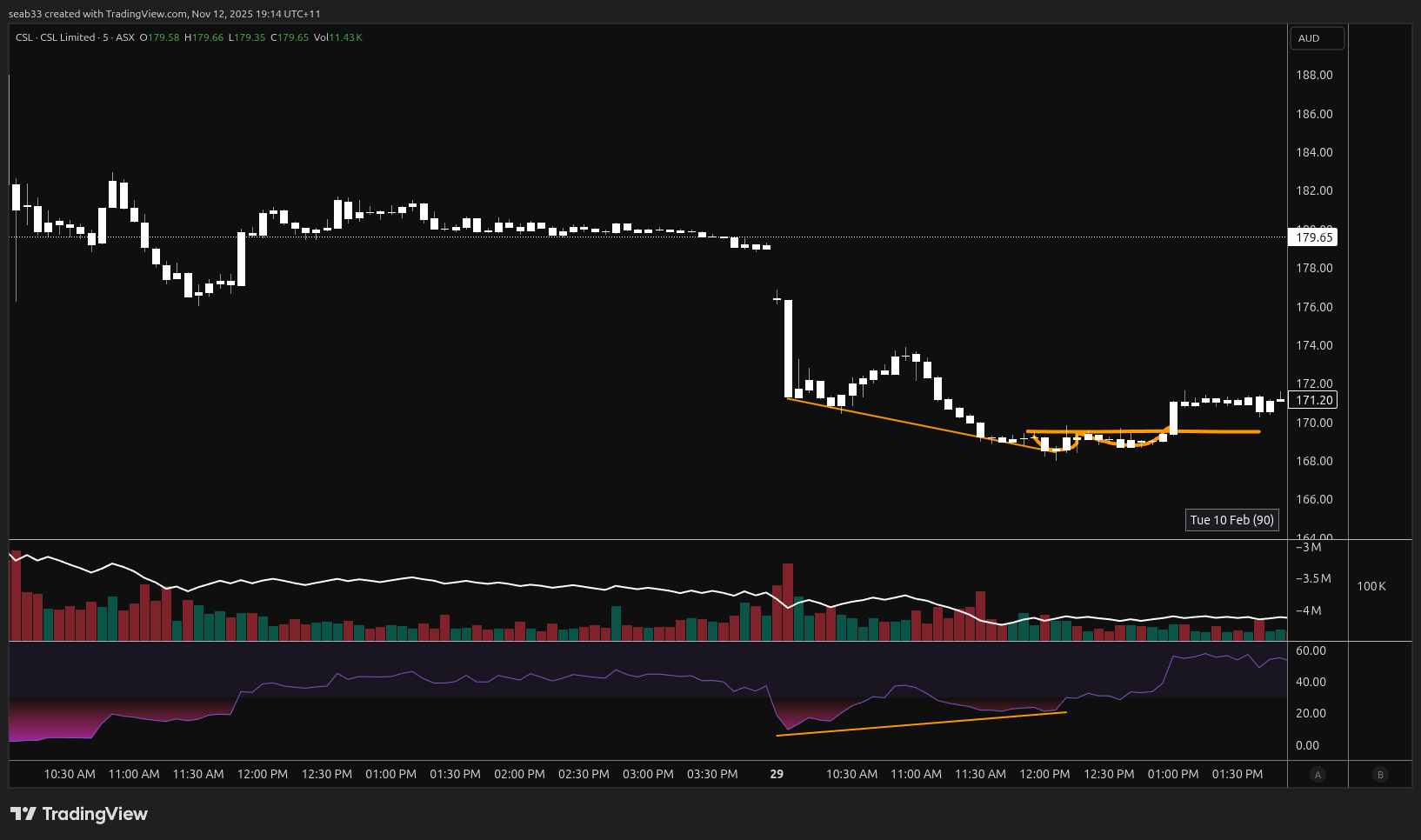 On the 5 min, we can see the bullish div on the RSI before the COMS